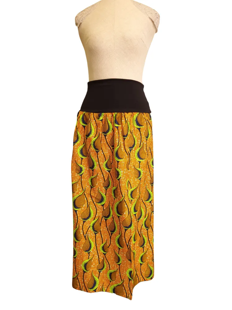 Exotická rozšířená sukně bez kapes vyrobena z africké látky je dokonalým kouskem pro nejen letní outfity. Elastický pas zvýrazní ženské křivky. Předností této sukně je rozparek na levé straně sukně.