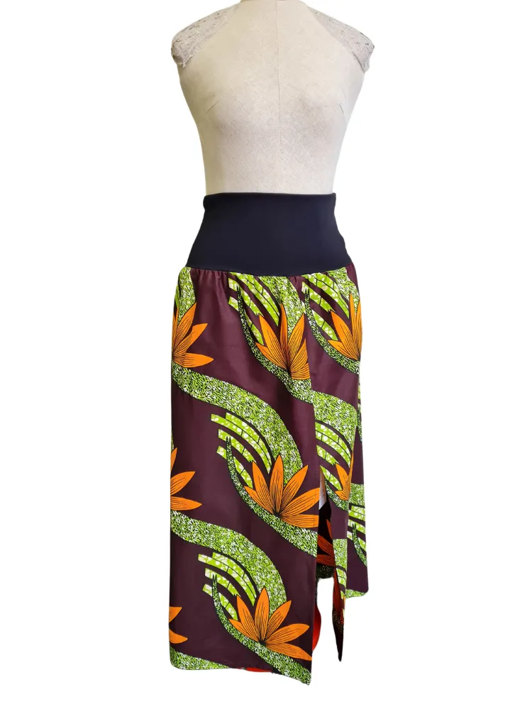 Exotická rozšířená sukně bez kapes vyrobena z africké látky je dokonalým kouskem pro nejen letní outfity. Elastický pas zvýrazní ženské křivky. Předností této sukně je rozparek na levé straně sukně.