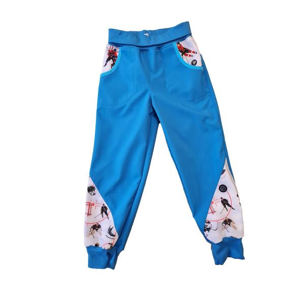 Rostoucí softshellové kalhoty, zimní, motiv Hokej, vel 116