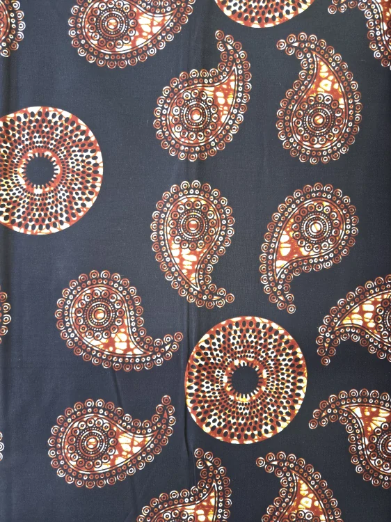 Chete být originální? Buďte! S našimi africkými látkami snadno vyjádříte svou originalitu a individualitu, své pocity i povahu. Africká bavlněná látka standardní kvality ideální pro ušití šatů, sukní i kalhot. V kombinaci s teplákovinou Vás oblékne do krásného a pohodlného kabátku. Lze ji navíc použít i jako potahový materiál, třeba na naše pohankové bochánky a meditační polštáře. Tištěno tradičními západoafrickými kombinacemi voskového tisku na extrémně měkké a odolné bavlněné textilie. Na obrázku vidíte velikost 1 yardu (91 cm).